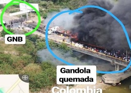- Otro falso positivo y elementos insurreccionales (15:50).En el lado fronterizo de Colombia, dos camiones que supuestamente transportaban «ayuda humanitaria» fueron incendiados sin mayores precisiones salvo por la automática traslación de la culpa a las fuerzas de seguridad del Estado venezolano, en un intento por crear otro falso positivo debido a la inconsistencia de la especie. Del otro lado de la frontera no hay funcionarios ni militares de la FANB que pudieran haber hecho tal acción beligerante. Asimismo, en La Grita (estado Táchira), un grupo de insurreccional («manifestantes pacíficos») tomaron control de una tanqueta de la GNB, del cual podrían hacer uso para otros montajes de banderas falsas, como ocurrió en la ciudad de Caracas hace un par de semanas con el secuestro de un vehículo de las FAES, o para actos terroristas contra la población y los cuerpos de seguridad estatales.