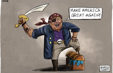 Caricatura: » Hacer que EEUU vuelva a ser grandioso» Piratería moderna de Mahmoud Abbas, Suecia.