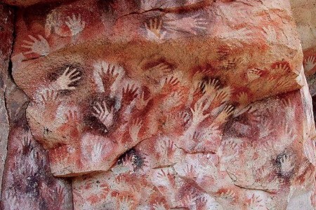 Imagen: Sector de la Cueva de las manos, ubicada en la Pagonia, en el valle del Alto Río Pinturas. Las pinturas y grabados de la Cueva de las Manos son registros de la vida de quienes poblaron la zona hace más o menos unos 10 mil años, en los periodos comprendidos en el oloceno temprano.