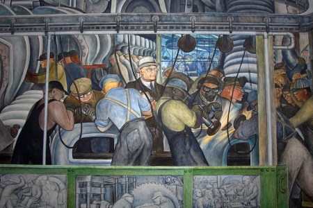 Imagen: Fragmento de los murales industriales del artista Diego Rivera pintados en Detroit por encargo de Edsel Ford para la compañía. El personaje principal es Charles Sorensen que entonces era el jefe de producción de la planta, Rivera refleja la relación entre la patronal y los trabajadores.