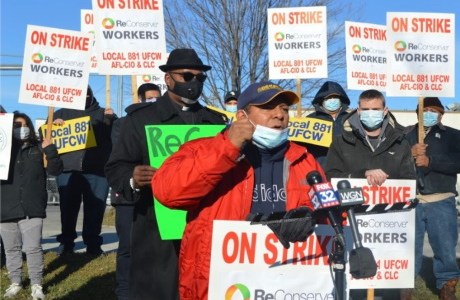 Si observamos una de esas pequeñas huelgas con más detalle, entenderemos mejor la situación. ReConserve es un fabricante de alimentos para animales, instalado en las afueras de Chicago, en Hodgkins. Se puede reconocer la planta gracias a una alta torre que pertenecía a un viejo molino. El trabajo es sucio y el material es peligroso. Veintiséis trabajadores, principalmente latinos representados por el sindicato UFCW Local 881 están en huelga en reclamo de un primer contrato. La paridad salarial con otras plantas de ReConserve y con otras fábricas en el parque industrial de Hodgkins es también un tema central.