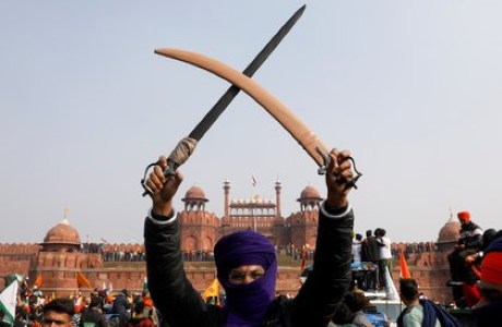 Foto. Un agricultor sostiene una espada durante una protesta contra las leyes agrícolas introducidas por el gobierno en el histórico Fuerte Rojo de Delhi, el 26 de enero de 2021 (REUTERS/Adnan Abidi)