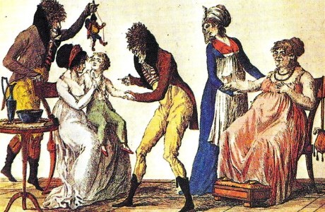 Imagen: Grabado de la Biblioteca Nacional de París que muestra una escena caricaturizada del uso de la vacuna. Imágenes Institución Fernán González.