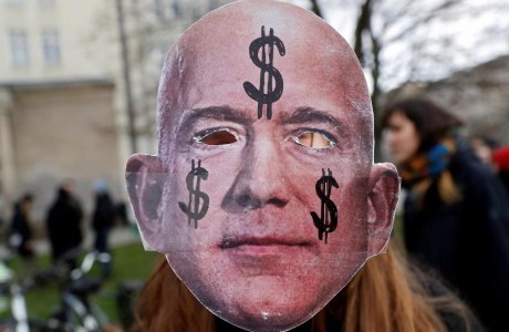 Foto: REUTERS/Michele Tantussi. Careta de Jeff Bezos de Amazon en una manifestación.