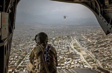 Foto: Un soldado estadounidense, con bandera recogida, a bordo de un helicóptero Chinook CH-47 observa el firmamento de Kabul.(Foto: Jim Huylebroek / The New York Times)