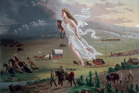 Pintura: Cuadro de John Gast (alrededor de 1871) titulado El Progreso Estadounidense. Es una representación alegórica del Destino Manifiesto. En la escena, una mujer angelical (a veces identificada como Columbia, una personificación del siglo XIX de los Estados Unidos de América) lleva la luz de la civilización hacia el oeste junto a los colonizadores, tendiendo líneas telegráficas y de ferrocarril mientras viaja. Los amerindios y animales salvajes huyen en la oscuridad hacia el incivilizado Oeste.