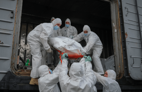 Foto: Militares ucranianos cargan cuerpos de soldados rusos a un vagón refrigerado en Kiev, Ucrania, 13 de mayo de 2022 (AP Photo/Efrem Lukatsky, archivo)