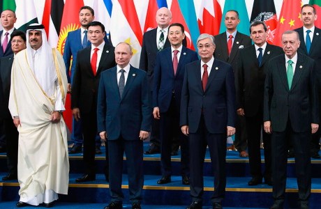 Foto: PHOTO/RAMIL SITDIKOV/KREMLIN via AP. De izquierda a derecha en primera fila: el emir de Qatar, jeque Tamim bin Hamad Al Thani, el presidente ruso Vladimir Putin, el presidente de Kazajistán Kassym-Jomart Tokayev, y el presidente de Turquía Recep Tayyip Erdogan posan para una foto en la cumbre de la Conferencia sobre la Interacción y las Medidas de Confianza en Asia (CICA), en Astana, Kazajistán, el jueves 13 de octubre de 2022.