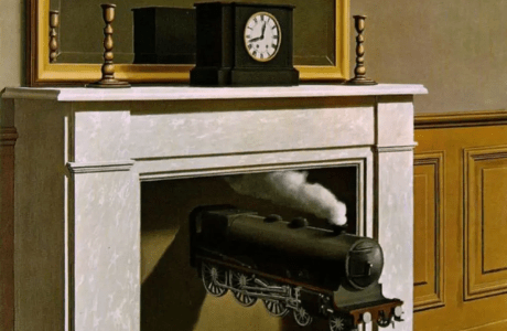 Pintura: La Durée Poignardée (El tiempo perforado), de René Magritte (1938).