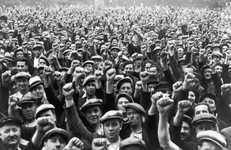 Foto: Obreros de la construcción en huelga saludan con el puño en alto durante un acto en el Bois de Vincennes, París, 13 de junio de 1936. (Foto: Keystone / Hulton Archive vía Getty Images)