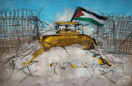 Pintura: Bulldozer en la frontera de Gaza por Beesan Arafat, 2023 (cortesía de The Art of Occupied Palestine).