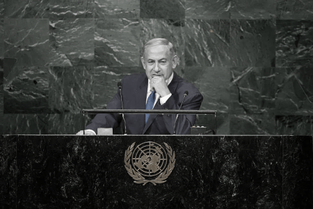 El primer ministro israelí, Benjamin Netanyahu, se dirige a la Asamblea General de las Naciones Unidas el 22 de septiembre de 2016, en Nueva York. Drew Angerer / Getty Images. Variación de OTL.