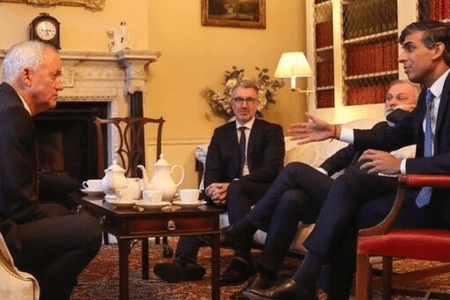 Foto: Benny Gantz (a la izquierda en la foto) viajó a Londres para reunirse con el consejero de seguridad nacional británico, Tim Barrow. Para sorpresa de Gantz, el primer ministro, Rishi Sunak (en el extremo derecho de la foto), también quiso conversar con él para decirle que Israel no debe convertirse en un Estado como los demás. El proyecto colonial británico sigue obstaculizando la paz.