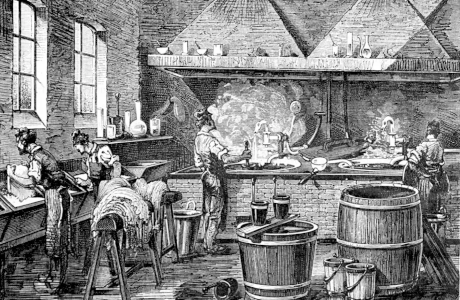 Imagen: Grabado en madera de trabajadores tiñendo pieles, ca. 1850. (Bettmann / Getty Images)