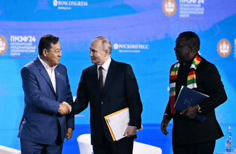 Foto: El presidente de Bolivia, Luis Alberto Arce Catacora, el presidente de Rusia, Vladimir Putin, y el presidente de Zimbabue, Emmerson Mnangagwa, asisten a una sesión plenaria del Foro Económico Internacional de San Petersburgo. © Sputnik / Sergey Bobylev