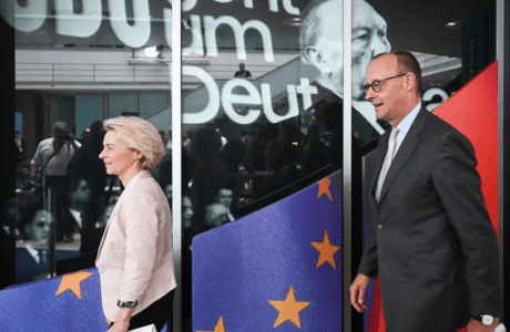 Foto: Friedrich Merz, presidente de la Unión Cristianodemócrata Alemana (CDU), y Ursula von der Leyen, principal candidata de la CDU a las elecciones europeas y presidenta de la Comisión Europea, en Berlín, Alemania, el 10 de junio de 2024. (Sebastian Christoph Gollnow / Getty Images)