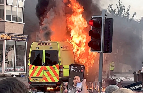Foto: Furgoneta en llamas durante disturbios en Southport, Inglaterra, el 30 de julio de 2024. (StreetMic LiveStream, Wikimedia Commons, CC BY 3.0)