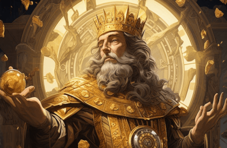 Un rey enloquecido por el hambre y la sed, desprovisto de amigos y familia, porque la felicidad buscada únicamente a través de la persecución del oro, al final, lo dejó rodeado de muerte y hambruna.