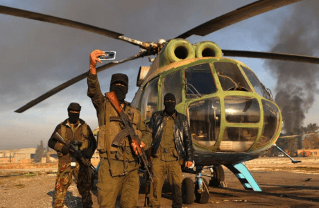 Foto: Grupo de yihadistas se hacen un selfie ante un helicóptero del Ejercito Sirio. AAREF WATAD/AFP via Getty Images