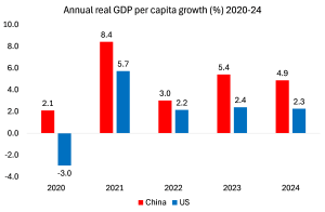 En cambio, fueron características de la economía de China. En 2024, el PIB real de China creció alrededor del 4,5%, mientras que el de Estados Unidos lo hizo en un 2,7% (más rápido que en cualquier otro lugar de las principales economías del G7, pero aun así sólo un 60% de la tasa de crecimiento de China).