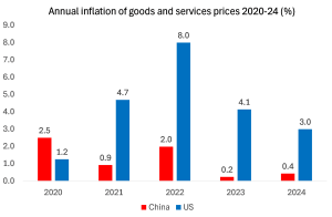 La inflación anual estadounidense ha sido muy superior a la china. De hecho, los precios estadounidenses aumentaron un 21 % acumulado desde 2020, frente a solo un 3 % en China.