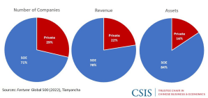 El capital total de las empresas con algún nivel de propiedad estatal en China es el 68% del capital total de todas las empresas (40 millones). La gran mayoría de las empresas chinas incluidas en la lista Fortune Global 500 son empresas estatales. Las empresas estatales generan al menos el 25% del PIB chino, según las estimaciones más conservadoras, y otros estudios han llegado a la conclusión de que contribuyen al 30-40+% del PIB.