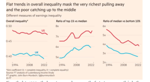 La razón no es que se haya invertido la tendencia al alza de la desigualdad, sino que la disparidad entre los ingresos de la parte más alta de la escala y los grupos de ingresos medios ha aumentado desde el cambio de milenio, mientras que la brecha entre la parte baja y la media se ha reducido. Los que más ganan se alejan del medio (de 6x a 7x) y los que menos ganan han reducido la distancia con el medio (de 5x a 4x).