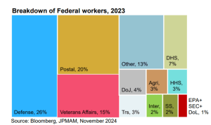 El empleo federal, de 3 millones de personas, está en su nivel más bajo como proporción del empleo estadounidense en 85 años (~2%). Dentro de los trabajadores federales, el mayor empleador es el Departamento de Defensa (excluyendo a los militares en activo), seguido por el Servicio Postal y Asuntos de Veteranos.