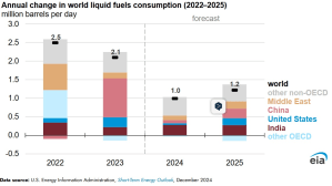 Lo que podría salvar la exigencia de Trump de precios más bajos del petróleo, a pesar de que el crecimiento de la oferta se está desvaneciendo, es que el crecimiento de la demanda global de productos petroleros también está disminuyendo. El crecimiento de la demanda se redujo casi a la mitad en 2024 en comparación con 2023.»