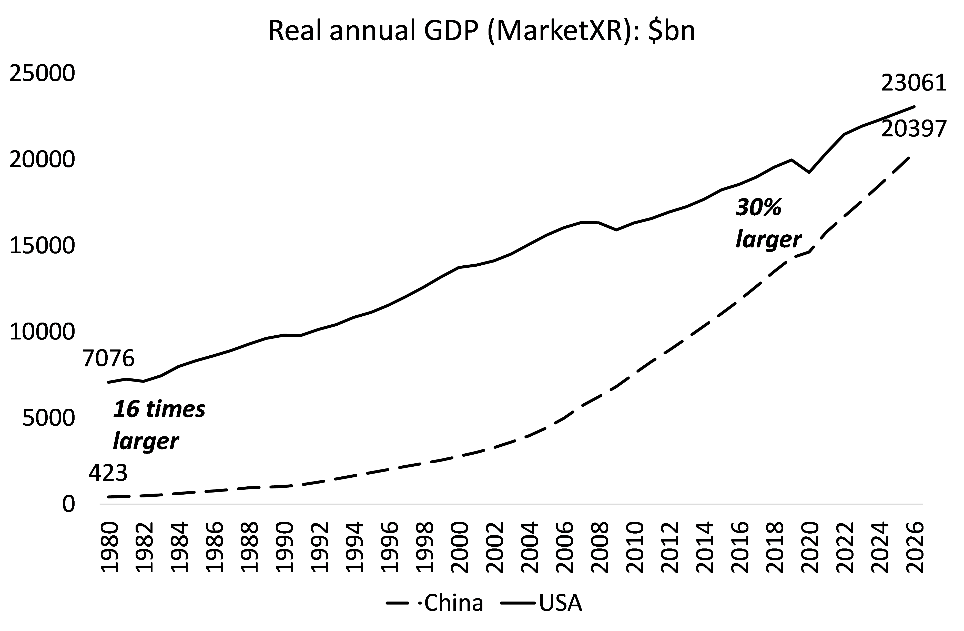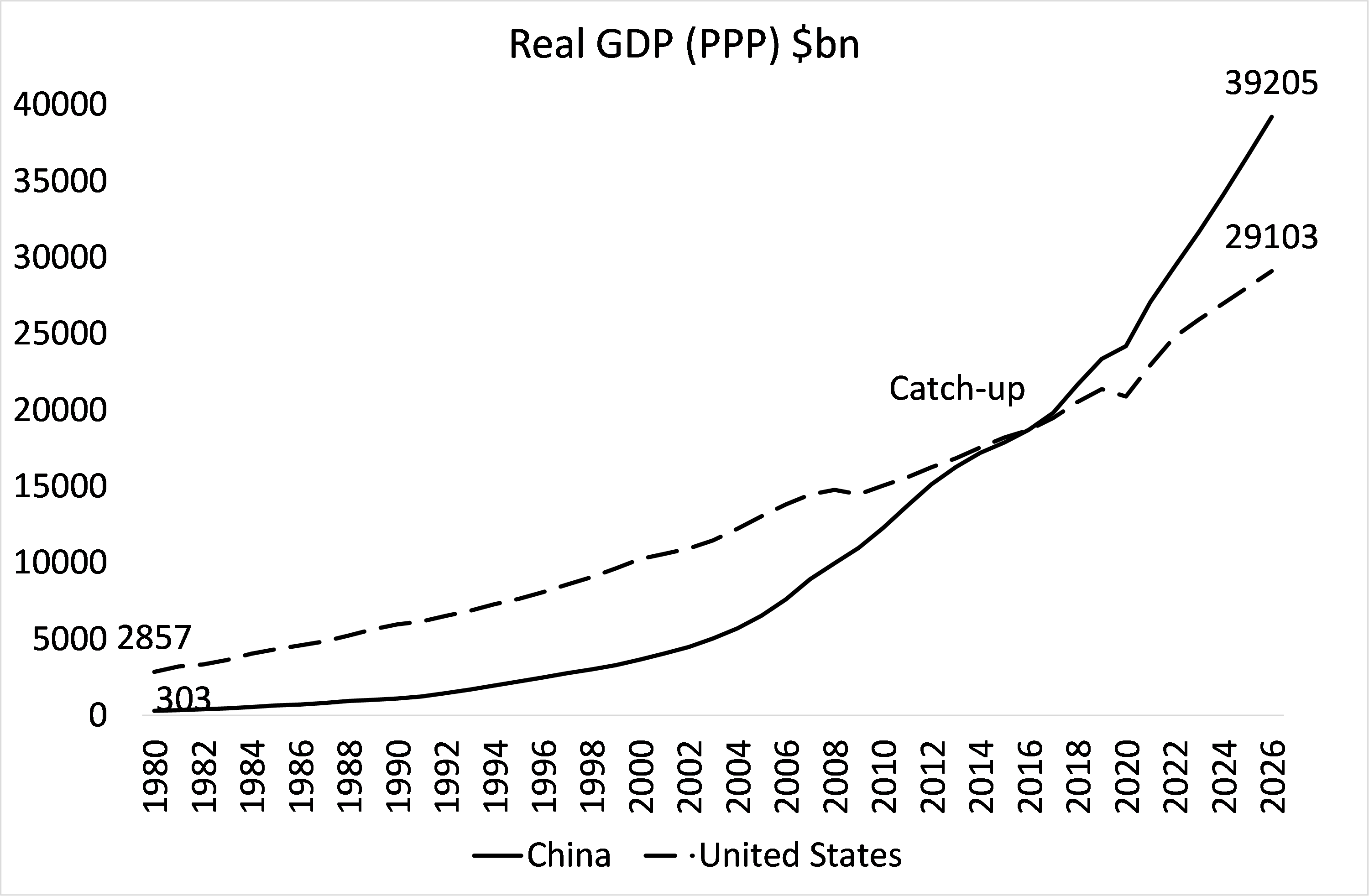 Si medimos el PIB real en dólares del mercado internacional, entonces el PIB de China sigue estando por detrás del de EE.UU. – pero la brecha se está cerrando.