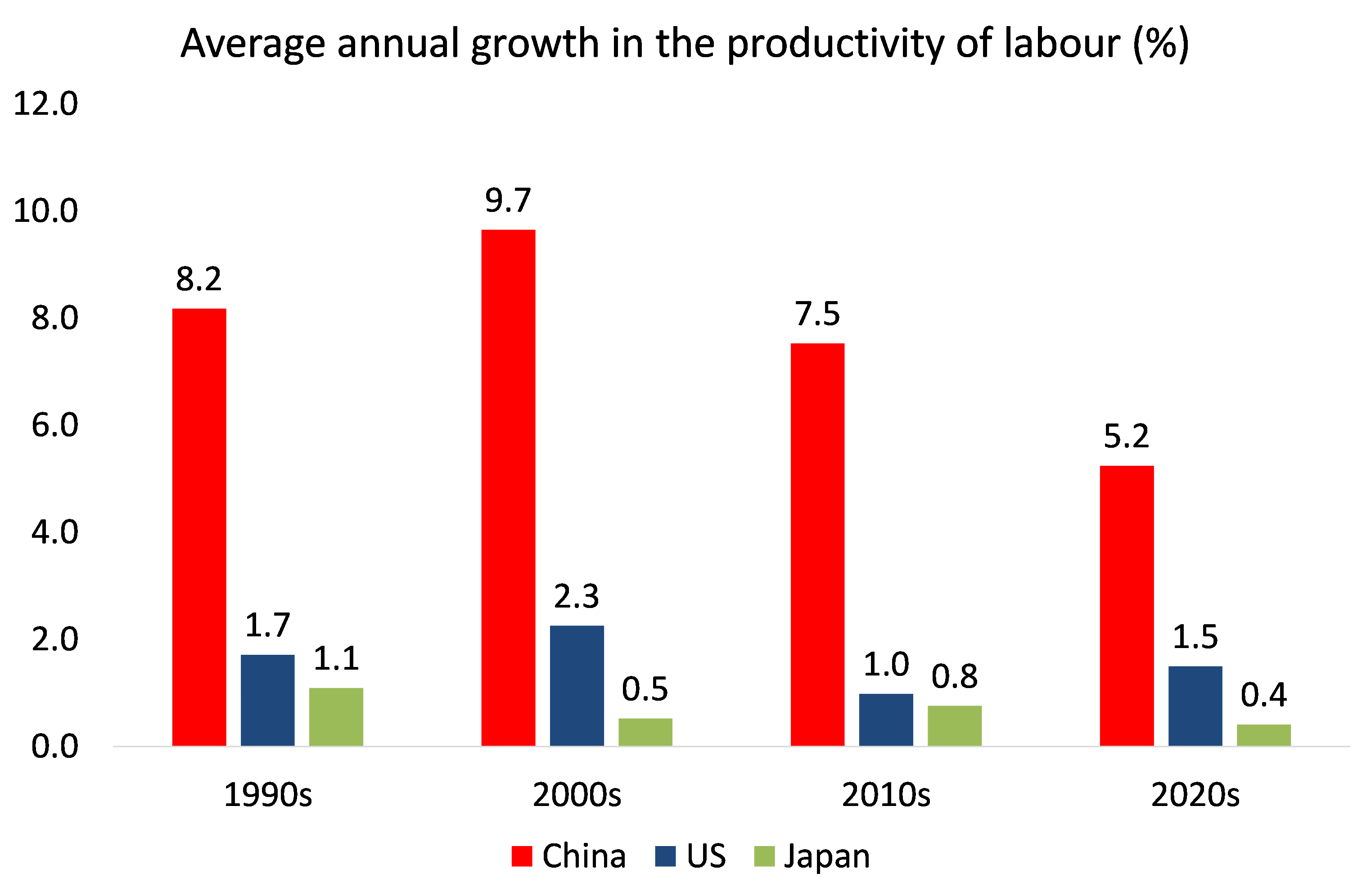 En cuanto a la japonización, China no está estancada como Japón. Tomemos como ejemplo el crecimiento de la productividad. Aunque el crecimiento de la productividad laboral en China se ha ralentizado en las dos últimas décadas, sigue siendo más de cuatro veces superior al de Estados Unidos y seis veces superior al de Japón.