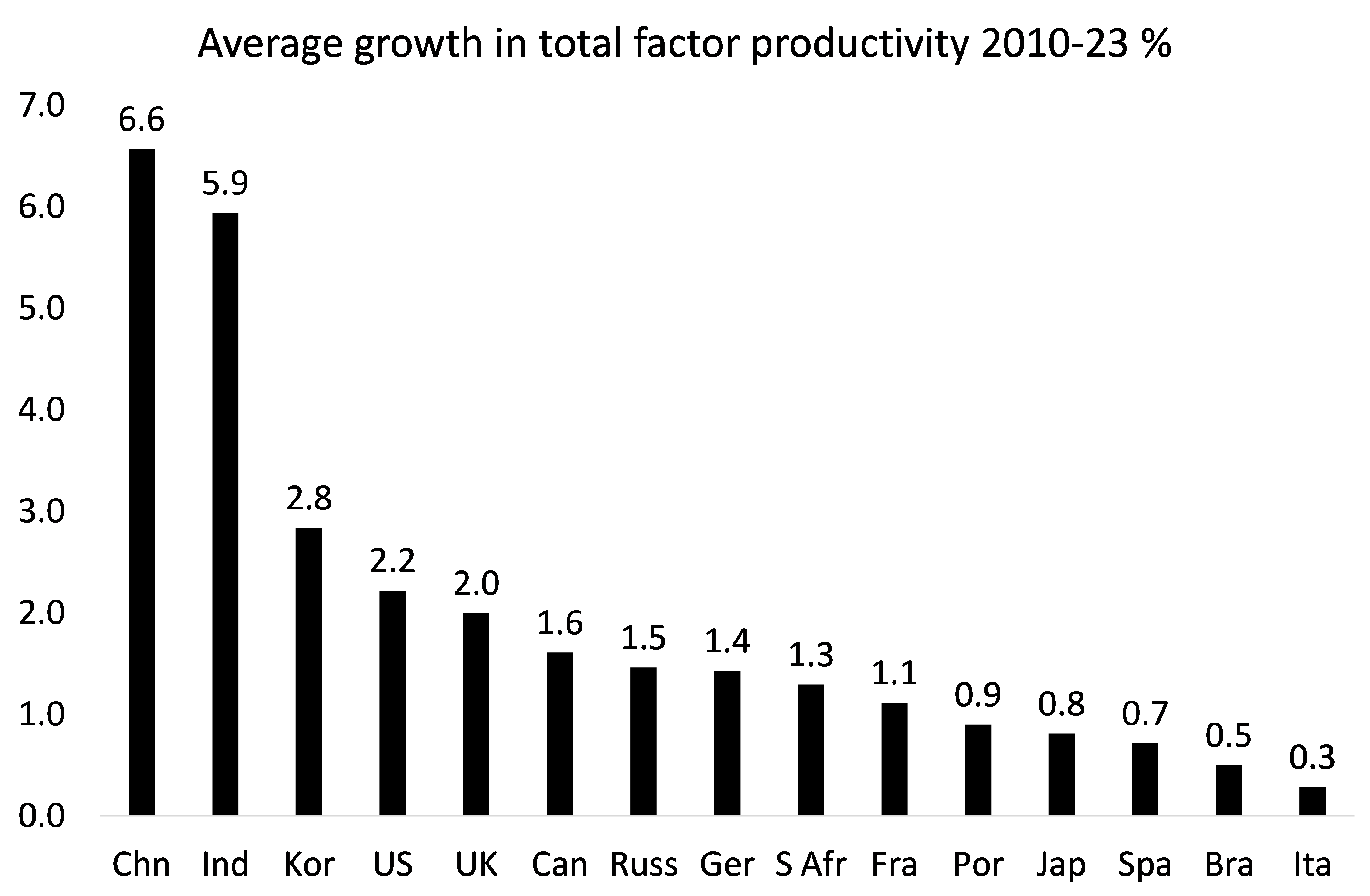 Pero incluso en su medida, el crecimiento de la PTF sigue siendo superior al de Estados Unidos, con un 0,5% anual en los últimos 20 años.