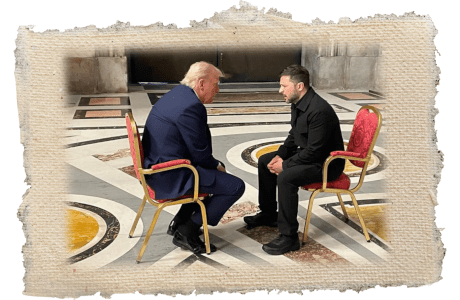 Foto: AFP. Los presidentes de EE UU y Ucrania, Donald Trump y Volodímir Zelenski, se reunieron este sábado en la Basílica de San Pedro durante el funeral del Papa. Diseño: OTL