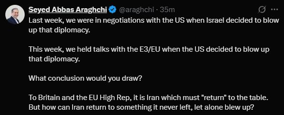 “La humanidad ha avanzado demasiado como especie para permitir que un matón sin ley nos lleve de vuelta a la ley de la selva”. Sayed Abbas Araghchi, ministro de Asuntos Exteriores de Irán, 2 minutos https://twitter.com/i/status/1936278121818571172