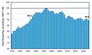 El salario medio por hora de un trabajador a tiempo completo en Japón no es superior al de 1993. Y el salario medio real por hora de todos los trabajadores japoneses —no solo los trabajadores a tiempo completo— ha bajado un 10 % desde su máximo de 1997.