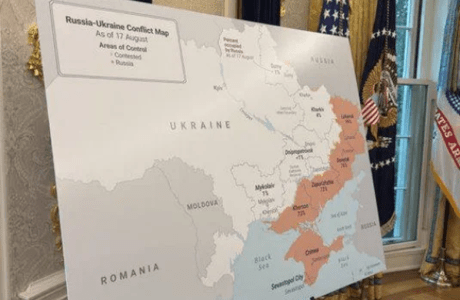 Foto: Se instaló un mapa convincente de Ucrania en el Despacho Oval para presentarselo a Zelensky y a los Europeos. Ilustración: «Pool No. 3».