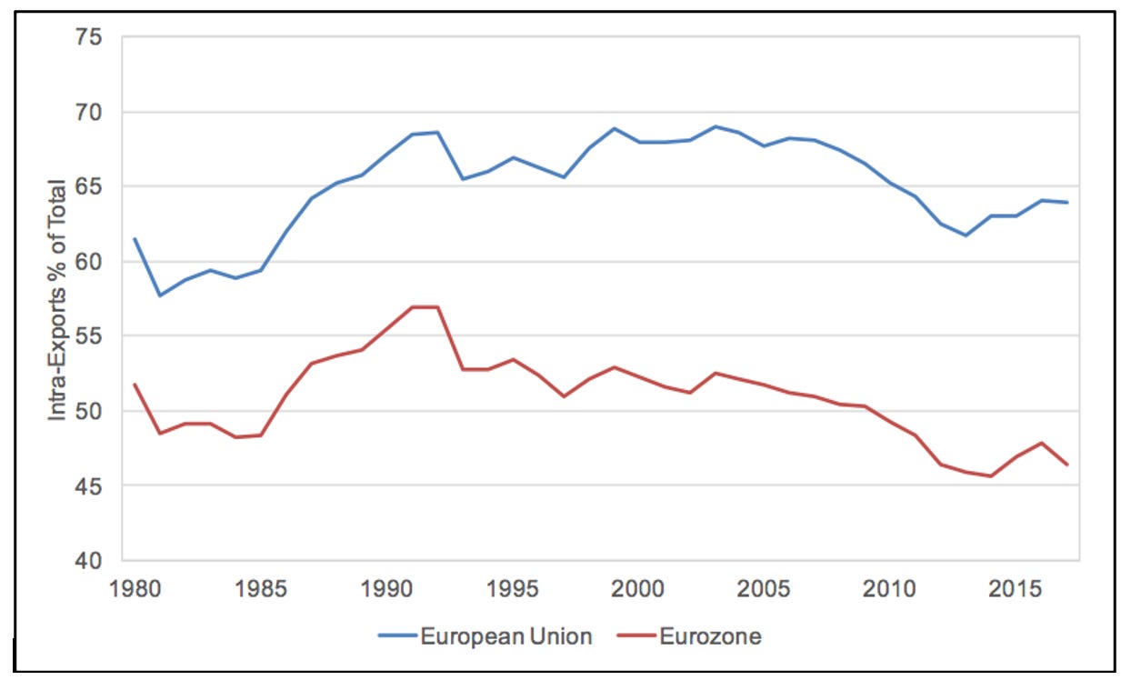 Sin embargo, a pesar de las predicciones de que una moneda común impulsaría sustancialmente el comercio entre los Estados miembros, al eliminar la incertidumbre sobre los tipos de cambio y reducir los costes de las transacciones transfronterizas, el comercio dentro de la zona del euro, como porcentaje del comercio total, ha disminuido constantemente desde entonces.