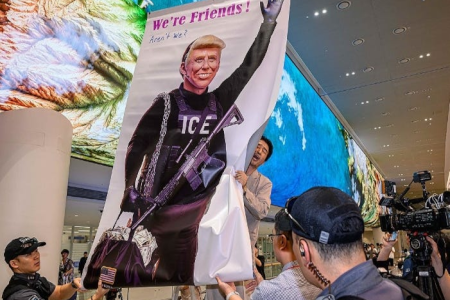 Las imágenes de la escena muestran a un manifestante exhibiendo una pancarta. La pancarta mostraba a Trump con un uniforme del ICE y empuñando un rifle, con las palabras “Somos amigos. ¿No es así?”.