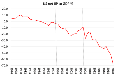 Posición de inversión internacional neta (IIP, siglas en ingles) de EE. UU. como porcentaje del PIB estadounidense