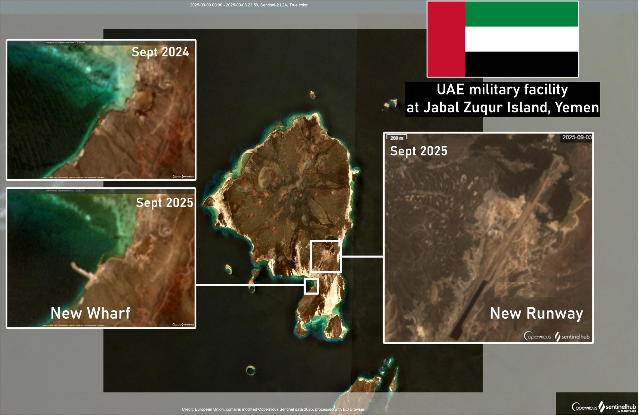 Entre 2023 y 2025, los Emiratos Árabes Unidos, con el respaldo de Israel, se han afianzado en todo el sur de Yemen. Las imágenes de satélite confirman la construcción de bases aéreas avanzadas, plataformas de inteligencia y centros logísticos en las islas de Shabwah, Socotra, Zuqar y Abd al-Kuri.