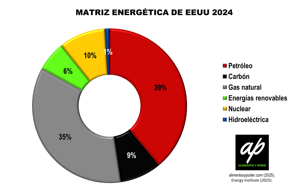 Esta lógica responde pragmáticamente y sin rodeos a la matriz energética de Estados Unidos que está soportada por petróleo y gas en un 74 %, representando el oro negro el 39 % de la torta, haciendo de esta una sociedad de consumo estrictamente hidrocarburífera.