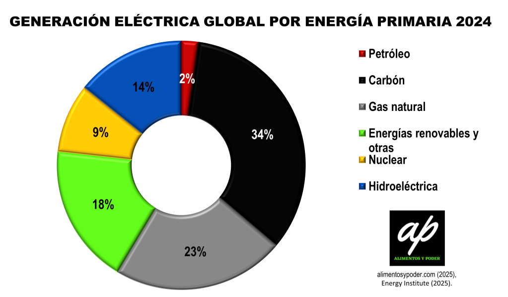 Electricidad que en la actualidad proviene de los combustibles fósiles en un 60 % a nivel global (ver imagen 2), principalmente del carbón (34 %) y cuyo núcleo de mayor producción se encuentra en China.
