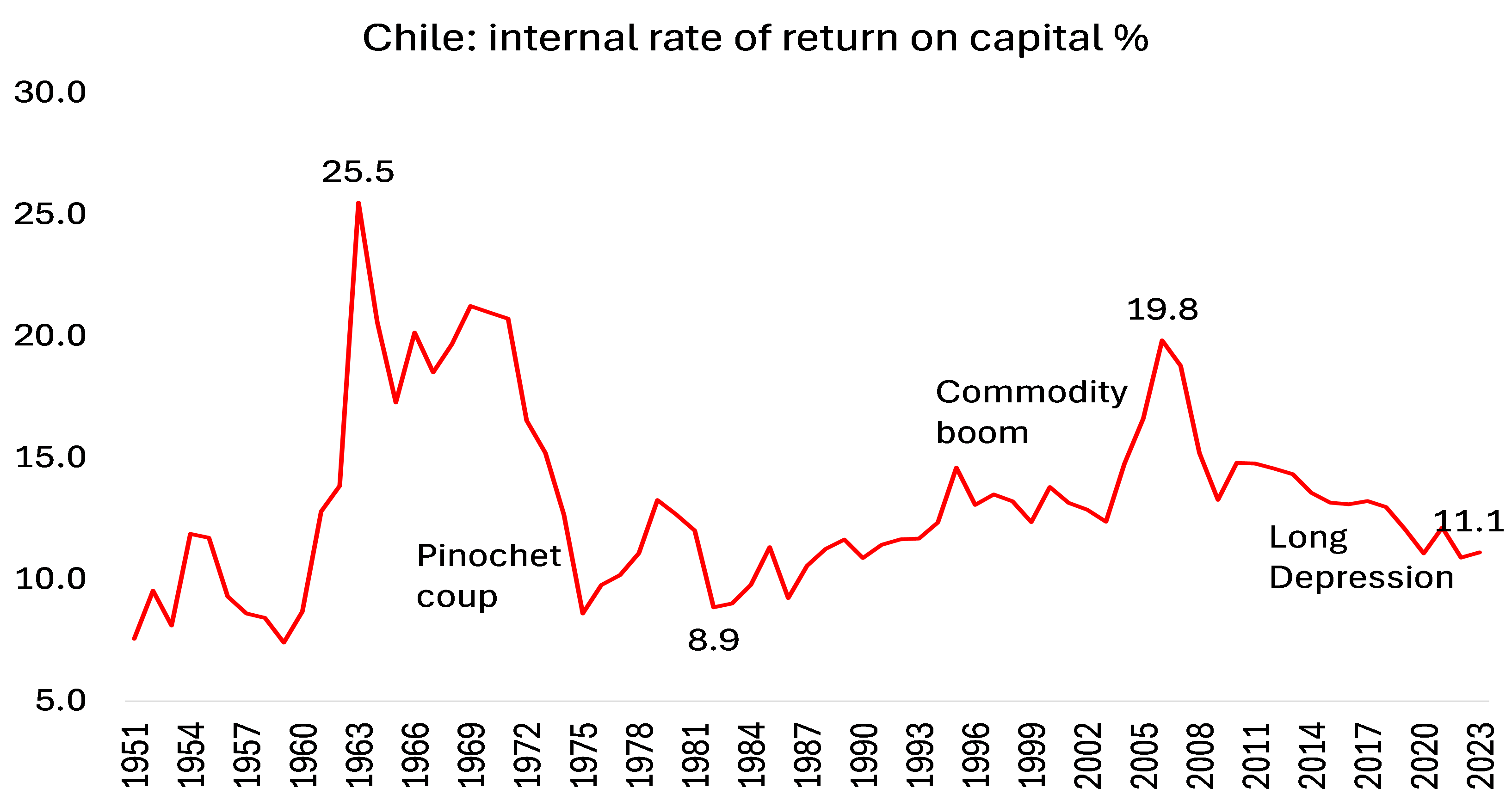 Finalmente, Chile volvió a la democracia en 1989, y el auge de los precios de las materias primas de la década de 2000 provocó un nuevo aumento de la rentabilidad hasta la Gran Recesión de 2008-2009.