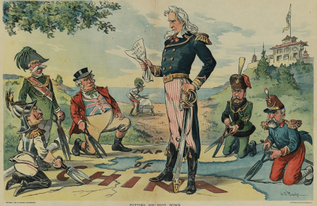 Foto: Puck Magazine / J.S. Pughe (CC). De izquierda a derecha: Alemania, Italia, Inglaterra, Rusia y Francia se preparan para repartirse China; mientras Austria, en el fondo, afila sus tijeras. En pie, el Tío Sam sostiene un tratado de comercio impuesto a China mientras les dice: «Señores, pueden cortar este mapa tanto como quieran; pero recuerden que yo he venido para quedarme y a mí no pueden dividirme en esferas de influencia».
