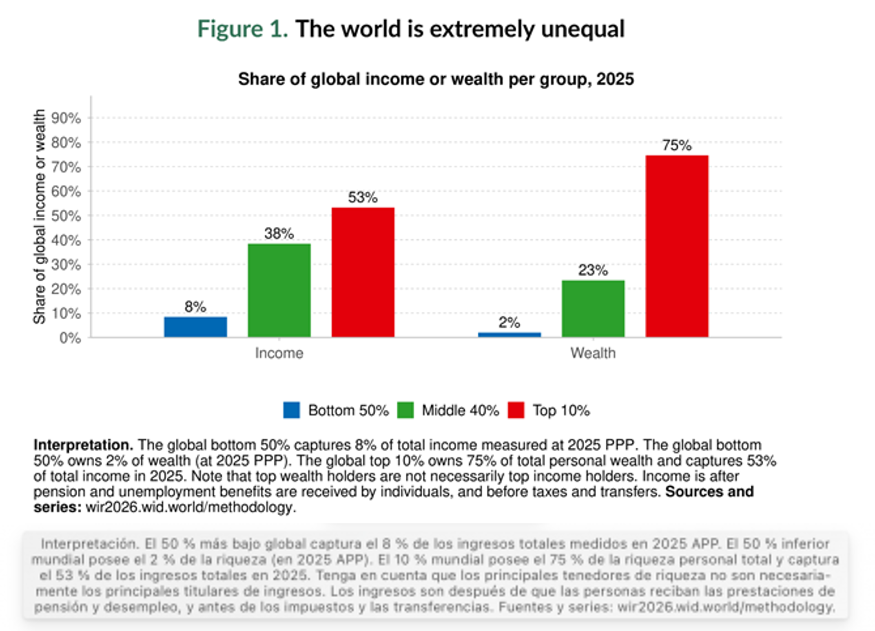 En 2025, el 10 % de la población mundial con mayores ingresos ganará más que el 90 % restante, mientras que la mitad más pobre de la población mundial obtendrá menos del 10 % de los ingresos totales mundiales. La riqueza –el valor de los activos de las personas– estaba aún más concentrada que los ingresos, o las ganancias del trabajo y las inversiones, según el informe, ya que el 10 % más rico de la población mundial poseía el 75 % de la riqueza y la mitad más pobre, solo el 2 %.