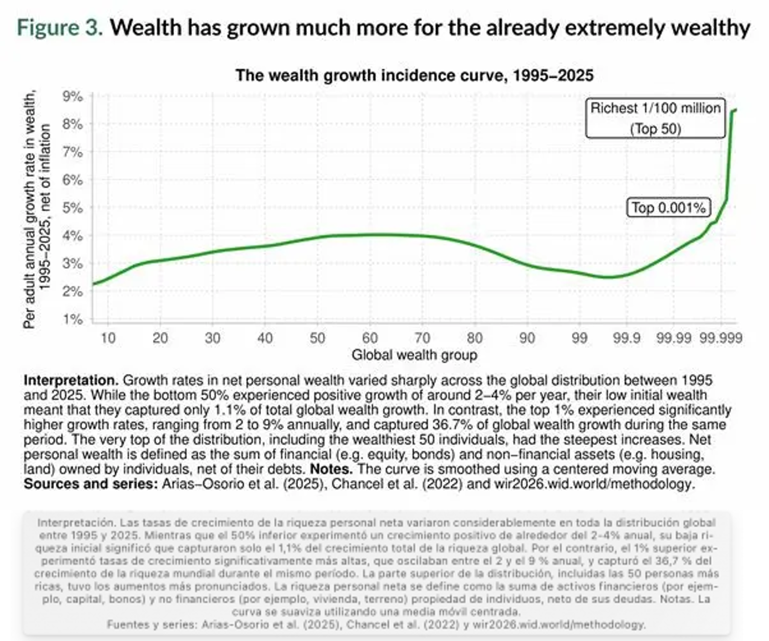 La gente más pobre han obtenido modestas ganancias, pero estas se ven eclipsadas por la extraordinaria acumulación en la cima. La parte de la riqueza mundial en manos del 0,001 % más rico ha pasado de casi el 4 % en 1995 a más del 6 %, según el informe, mientras que la riqueza de las y los multimillonarios ha aumentado alrededor de un 8 % anual desde la década de 1990, casi el doble de la tasa del 50 % más pobre.