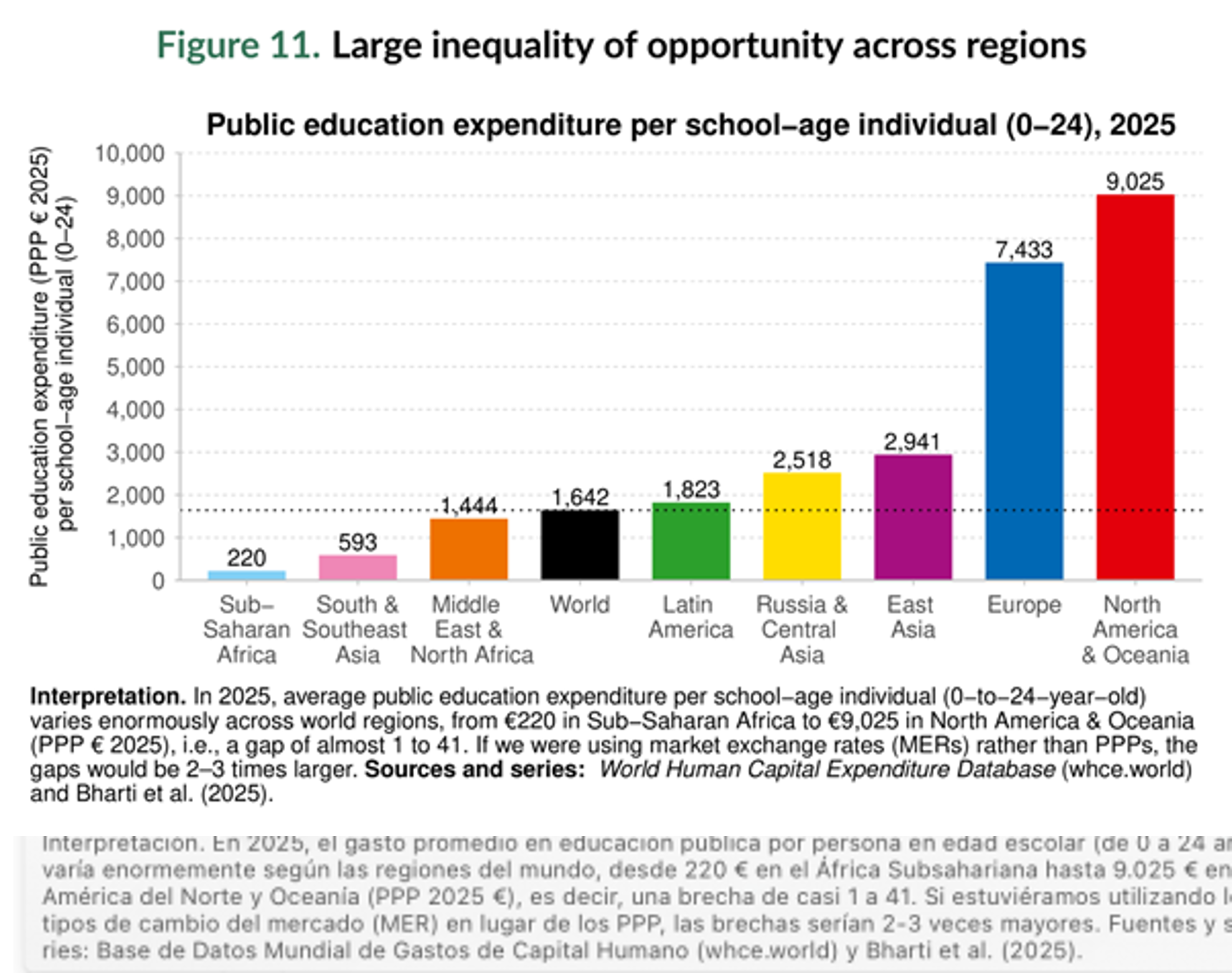 Más allá de la estricta desigualdad económica, el informe constata que esta desigualdad alimenta la desigualdad de resultados, ya que el gasto en educación por niño en Europa y América del Norte, por ejemplo, es más de 40 veces superior al de África subsahariana, una diferencia aproximadamente tres veces mayor que el PIB per cápita.