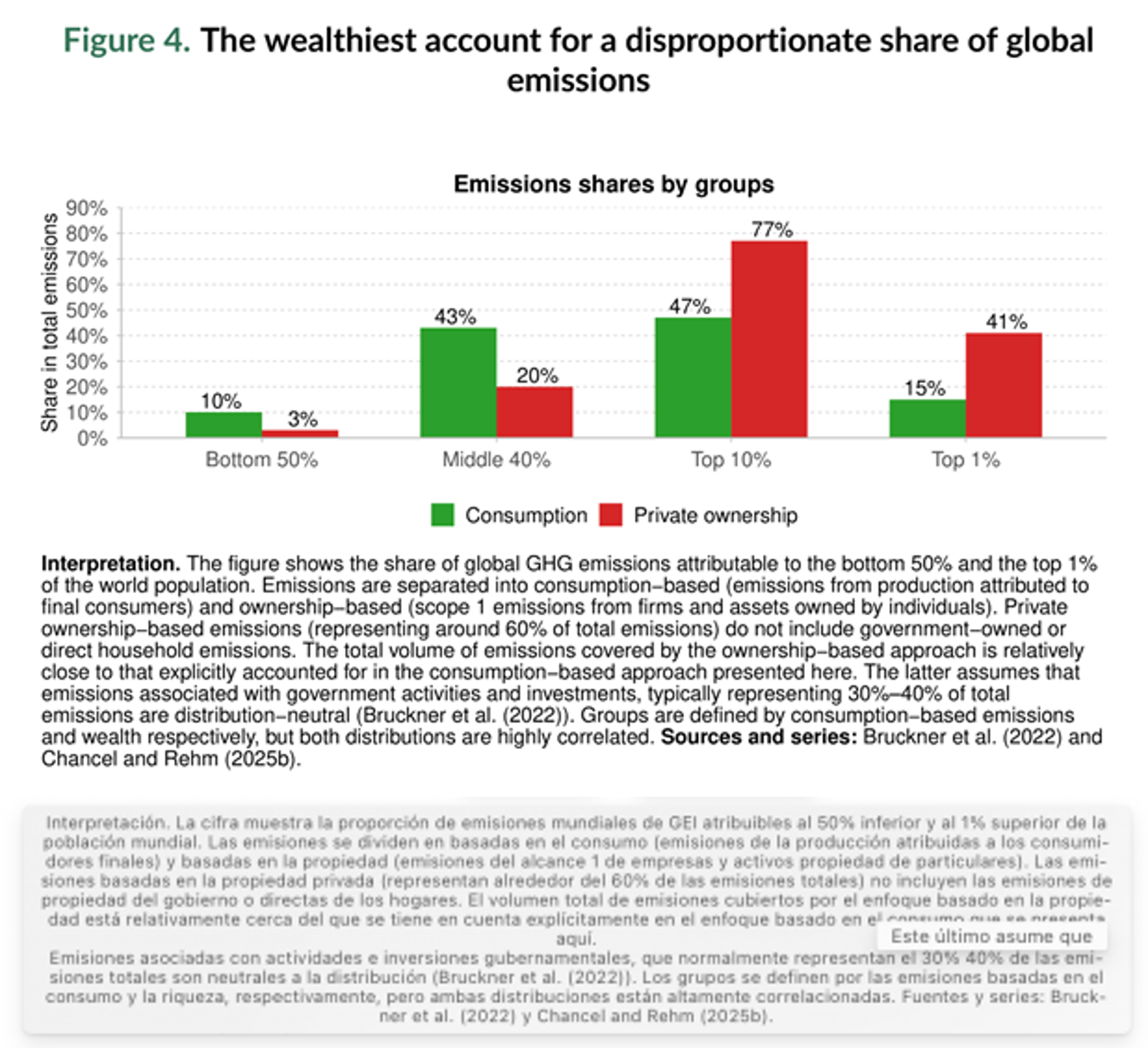 Y la desigualdad está generando más emisiones de gases de efecto invernadero. El informe muestra que la mitad más pobre de la población mundial representa solo el 3 % de las emisiones de carbono asociadas a la propiedad de capital privado, mientras que el 10 % más rico representa alrededor del 77 % de las emisiones.