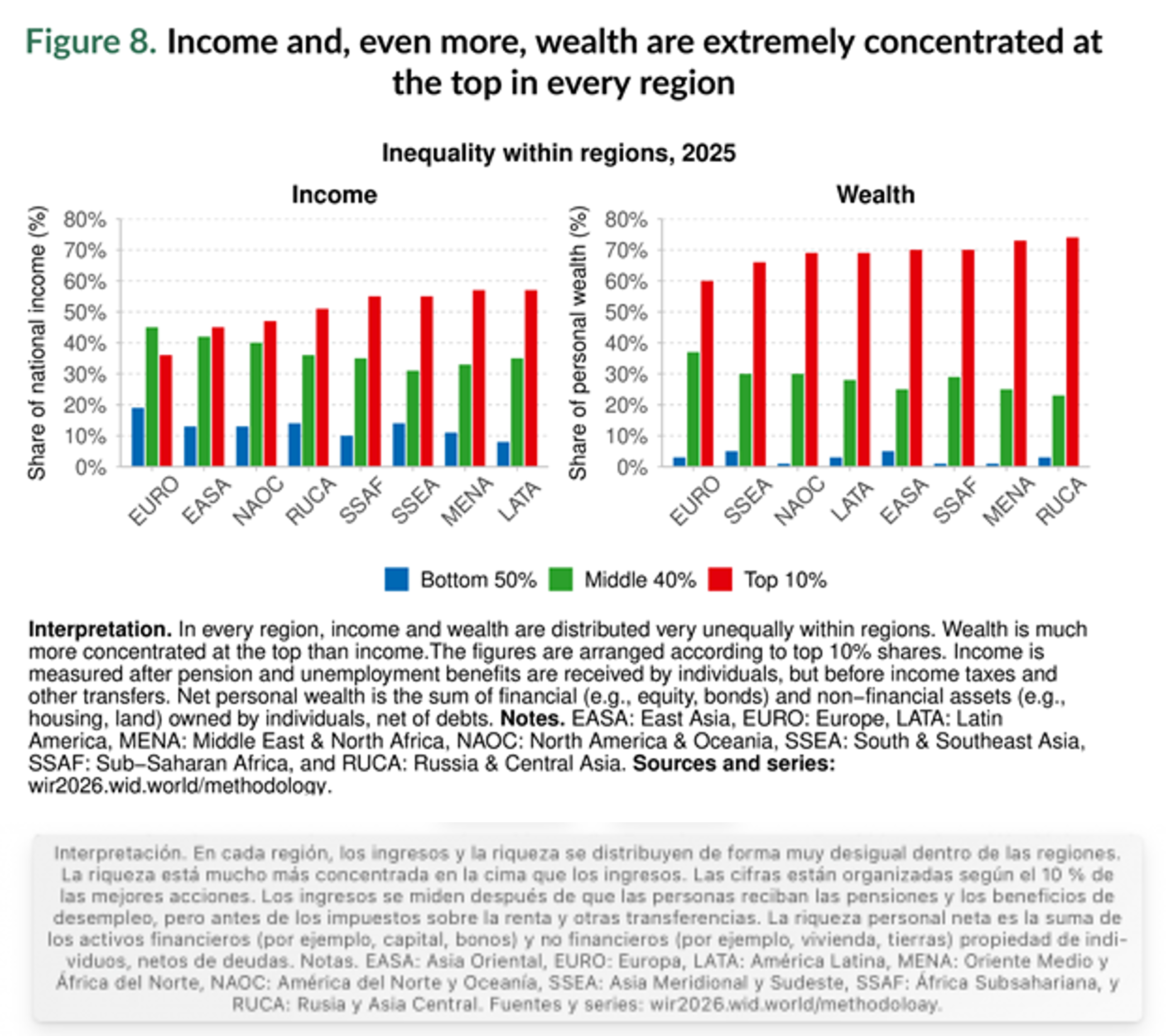 Los ingresos se distribuyen de forma desigual en todas partes, y el 10 % más rico obtiene sistemáticamente mucho más que el 50 % más pobre. Pero en lo que respecta a la riqueza, la concentración es aún más extrema. En todas las regiones, el 10 % más rico controla más de la mitad de la riqueza total, dejando a menudo a la mitad más pobre con solo una pequeña fracción.