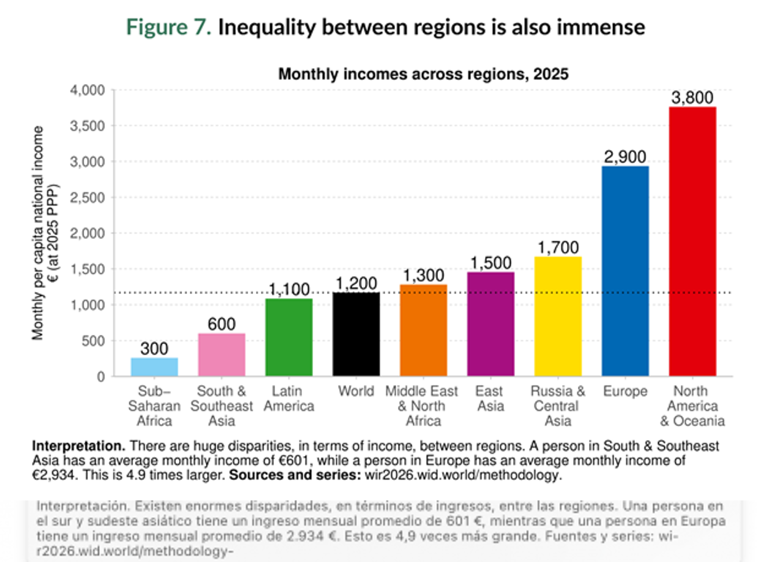 Estos promedios globales ocultan enormes diferencias entre las regiones. El mundo está dividido en claros niveles de ingresos: regiones de altos ingresos, como América del Norte, Oceanía y Europa; grupos de ingresos medios, como Rusia , Asia Central, Asia Oriental, Oriente Medio y África del Norte; y regiones muy pobladas donde los ingresos medios siguen siendo bajos, como América Latina, Sur y Sudeste de Asia y África Subsahariana.